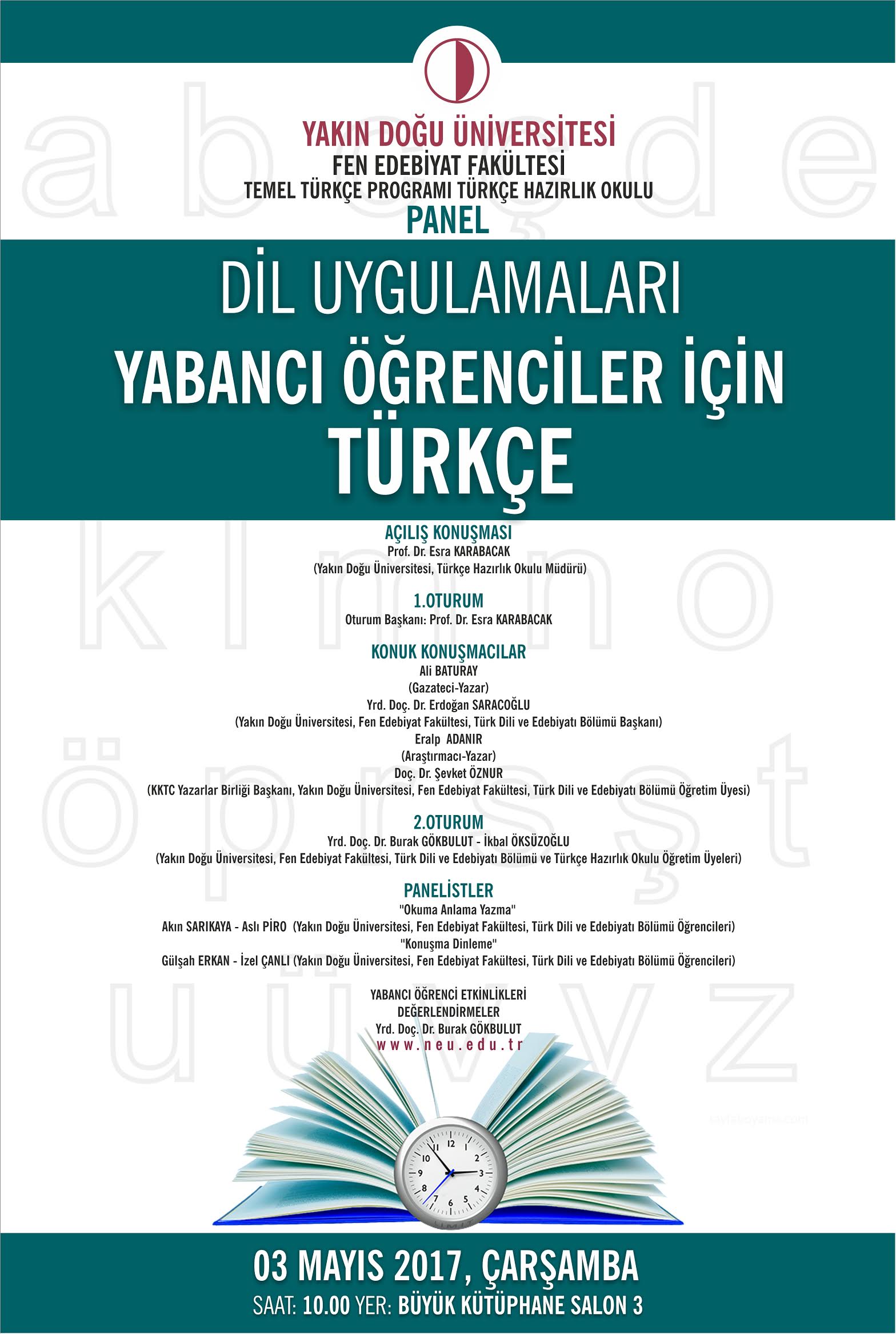 Yakın Doğu Üniversitesi Fen Edebiyat Fakültesi Türkçe Hazırlık Okulu bünyesinde 3 Mayıs 2017 Çarşamba saat 10.00’da YDÜ Büyük Kütüphane Salon 3’de Dil Uygulamaları –Yabancılar İçin Türkçe Konulu bir panel düzenliyor.